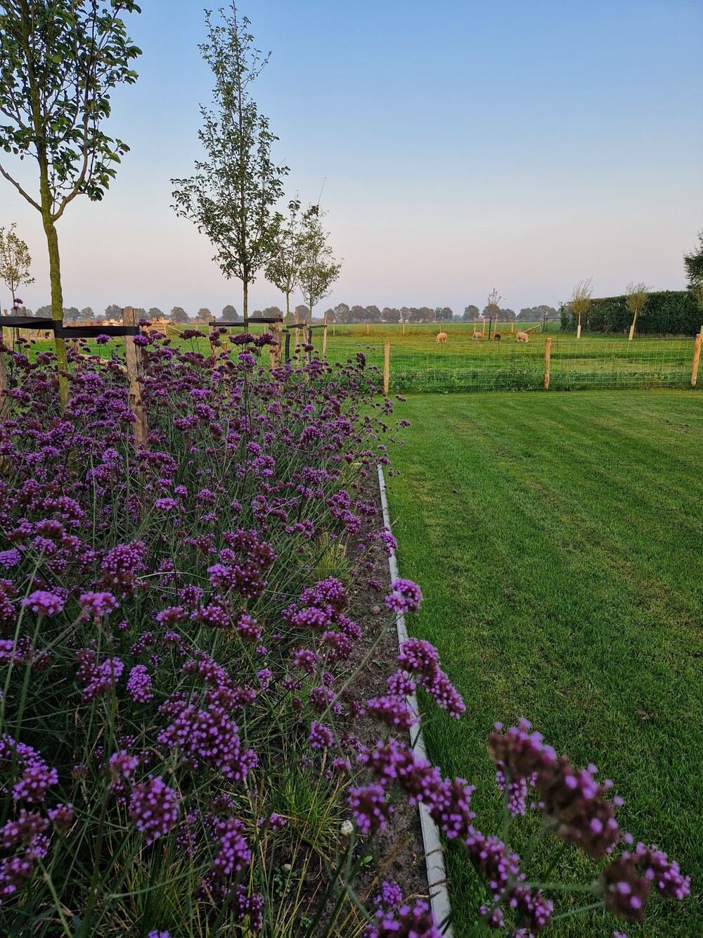 De grote borders zijn gevuld met een prachtig mengsel van bloeiende vaste planten die vlinders en bijen aantrekken. Het is klimaat-adaptieve beplanting met veel inheemse gewassen die de biodiversiteit ten goede komt.